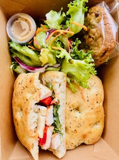 Boxed lunch. A gourmet sandwich, organic mixed greens with balsamic vinaigrette and a fresh baked cookie. Served with a drink. Includes a compostable cutlery kit.